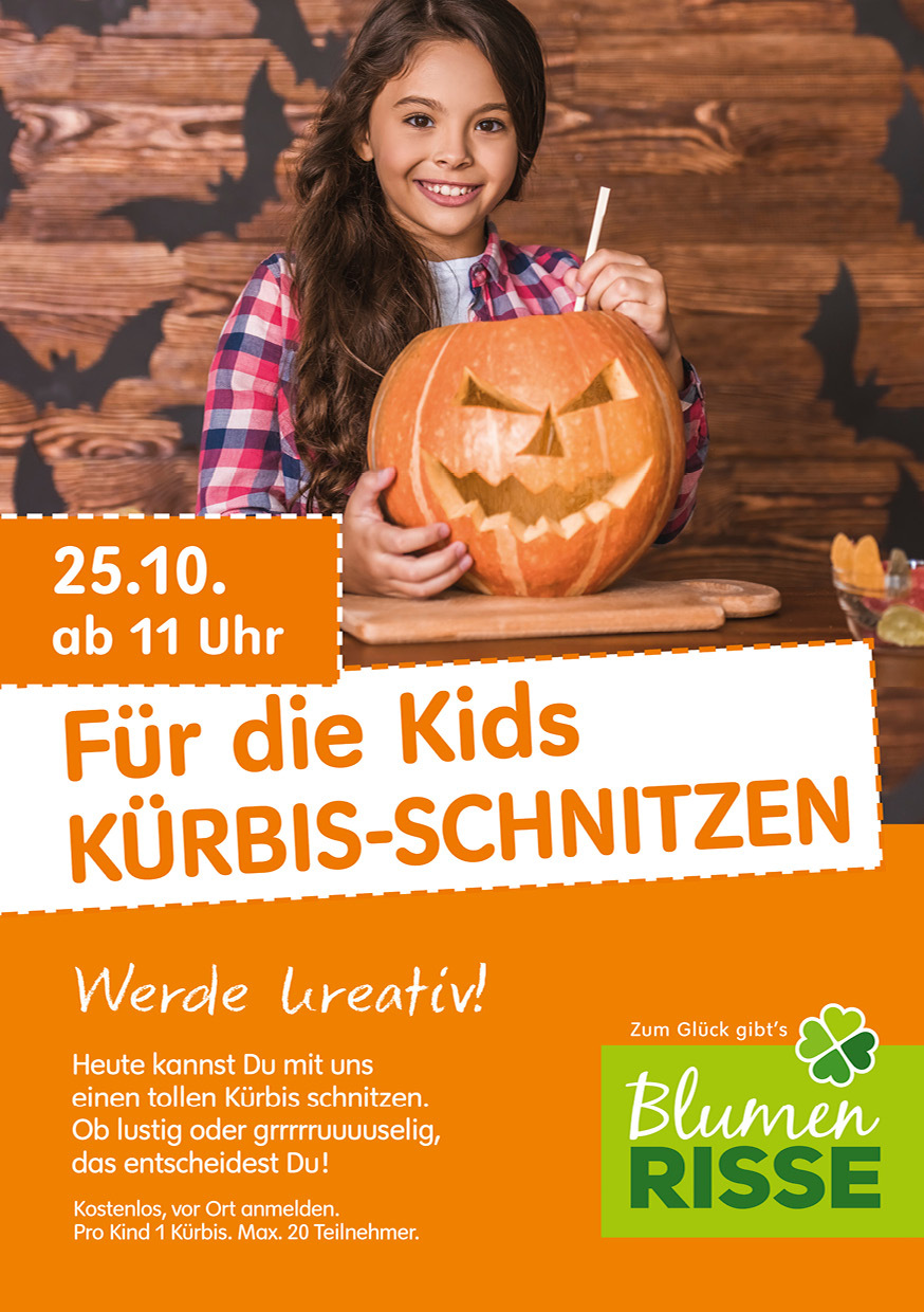 Wir ladenam Samstag, den 25. Oktober von 11.00 - 14.00 Uhr, Kinder zum Kürbis schnitzen in unsere Gartencenter und Blumenmärkte ein.