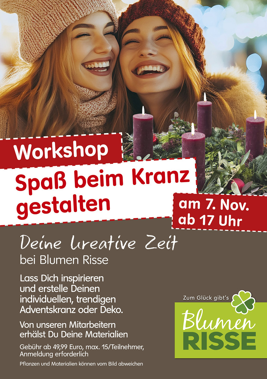 Wir laden am Freitag, den 07.November 2025, ab 17.00 Uhr zum Adventskranz-Workshop in unsere Gartencenter und Blumenmärkte ein.