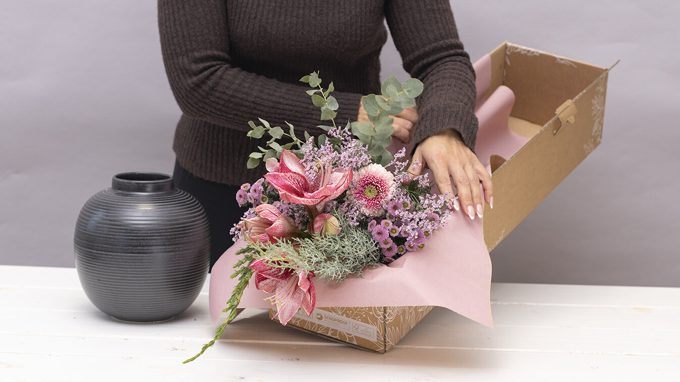 Unsere Blumenboxen werden mit frischen Blumen direkt aus unserem Kühlhaus zusammengestellt und so schnell wie möglich versendet. Damit sie unversehrt bei der Empfängerin oder dem Empfänger ankommen, achten wir selbstverständlich auf einen zuverlässigen und sicheren Transport. Dafür legen wir die Blumen vorsichtig in einen stabilen Karton, der ihm den besten Halt gibt. Außerdem werden die Blumen vor dem Versenden mit einer feuchtigkeitsspendenden Schutzwindel versehen, damit sie während des Transports nicht austrocknen.