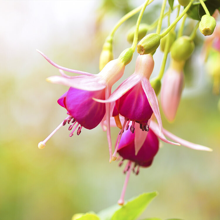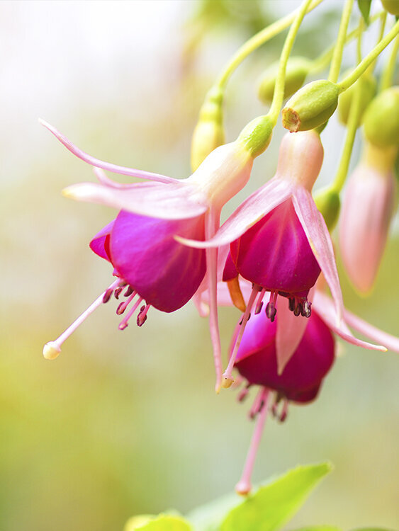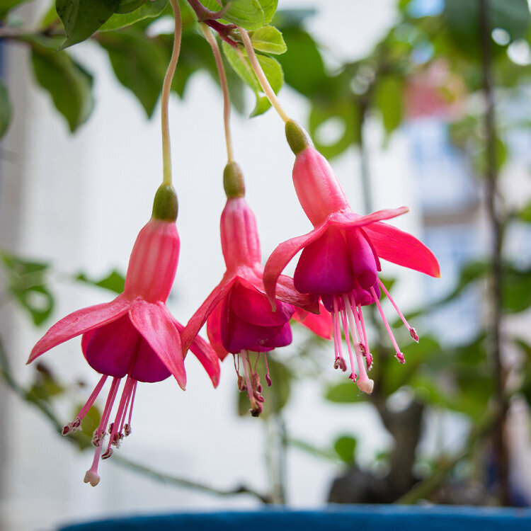 Unser Tipp: Hängende Fuchsien kommen in Ampeln besonders gut zur Geltung – so können ihre Blüten frei nach unten wachsen und wirken besonders dekorativ.