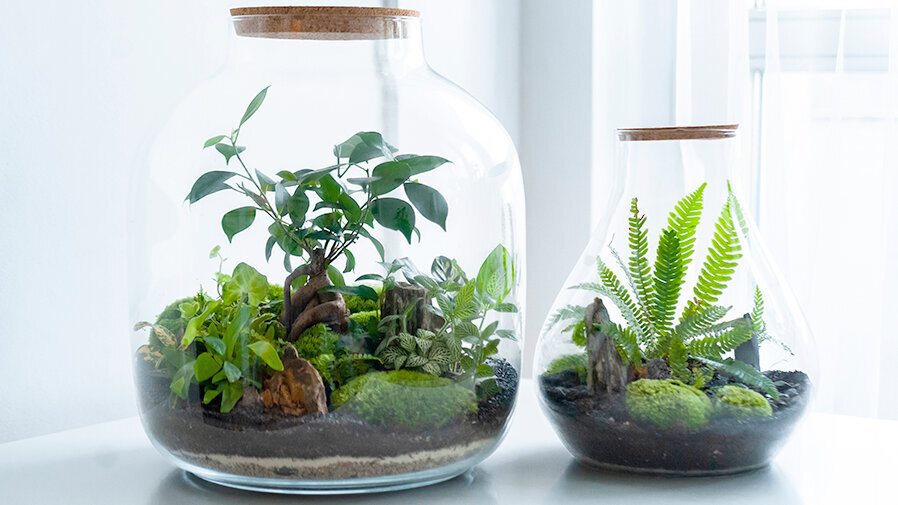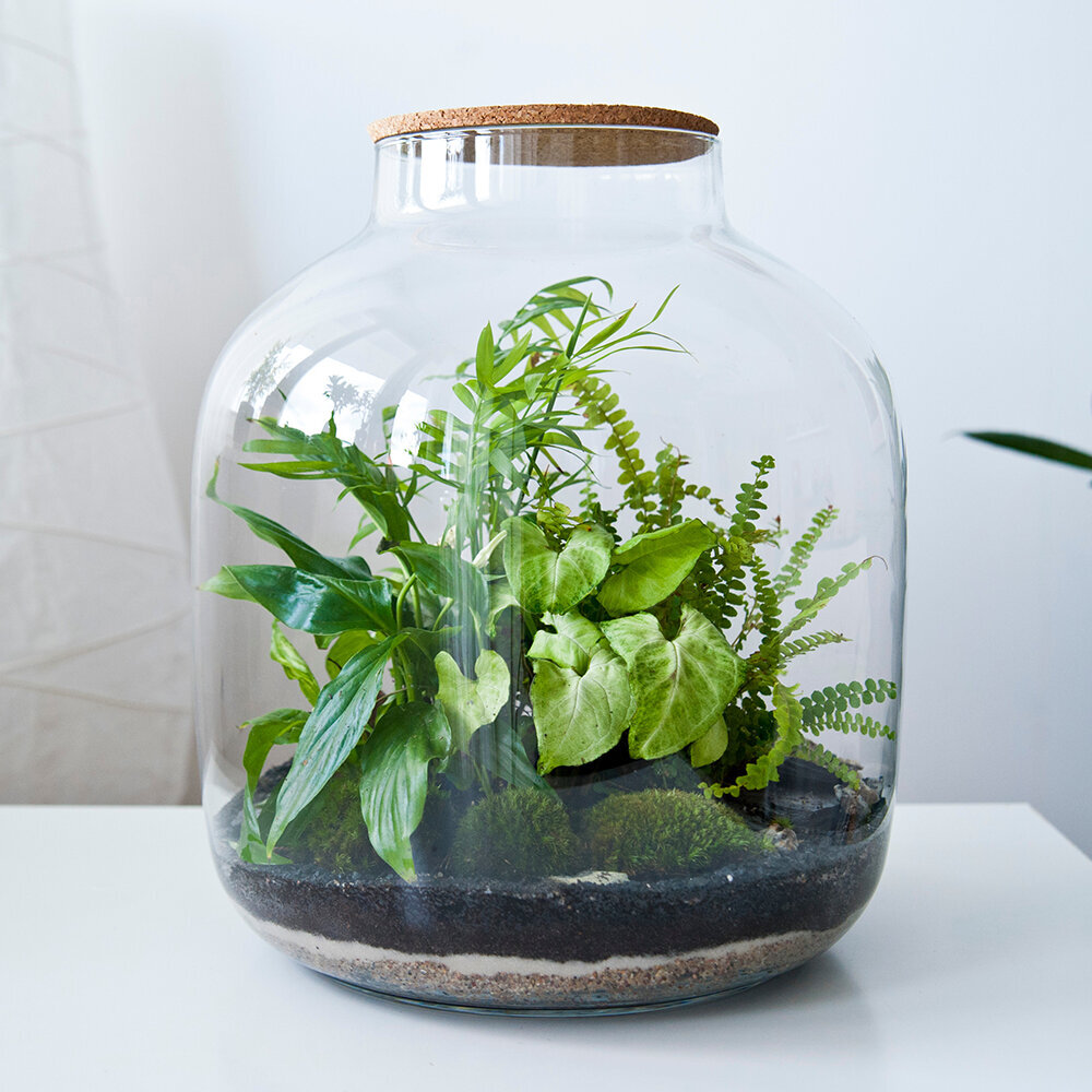 Der Flaschengarten hat mit seinem ruhigen Erscheinungsbild einen besonderen Auftritt unabhängig von Jahreszeiten. Alsgeschlossenes Ökosystem im Glas wirkt er modern, elegant und gleichzeitig natürlich.