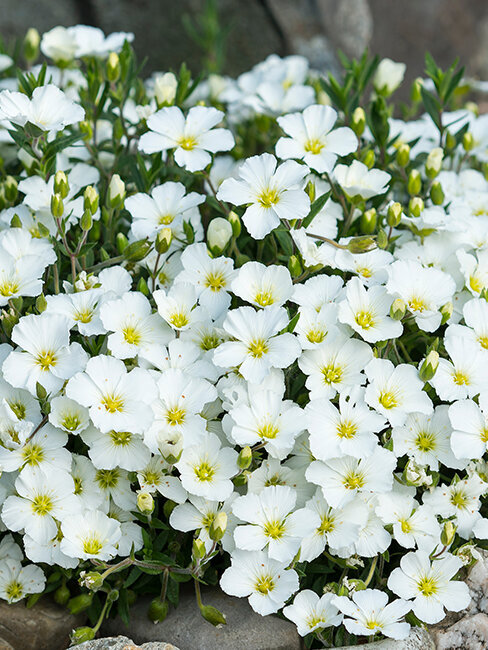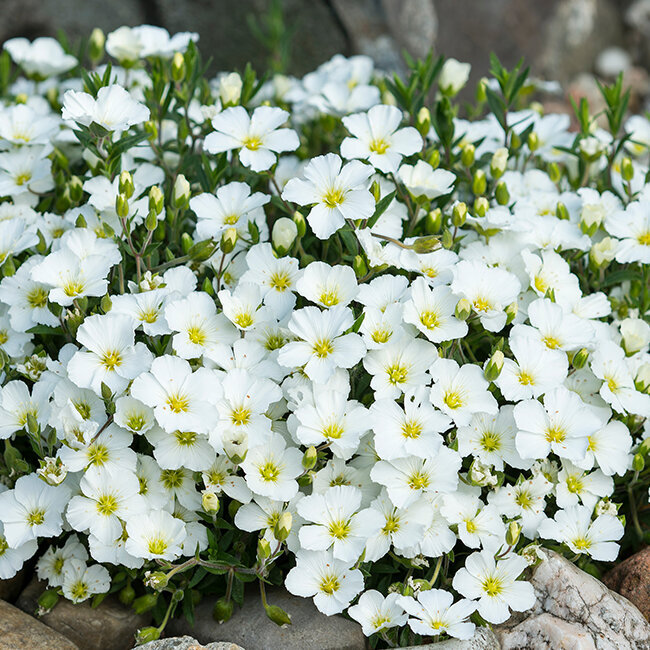 Arenaria ist eine mattenbildende, immergrüne Polsterstaude mit vielen weißen Blüten – perfekt für Steingarten, Fugen/ Mauerkronen und sonnige Beetränder.